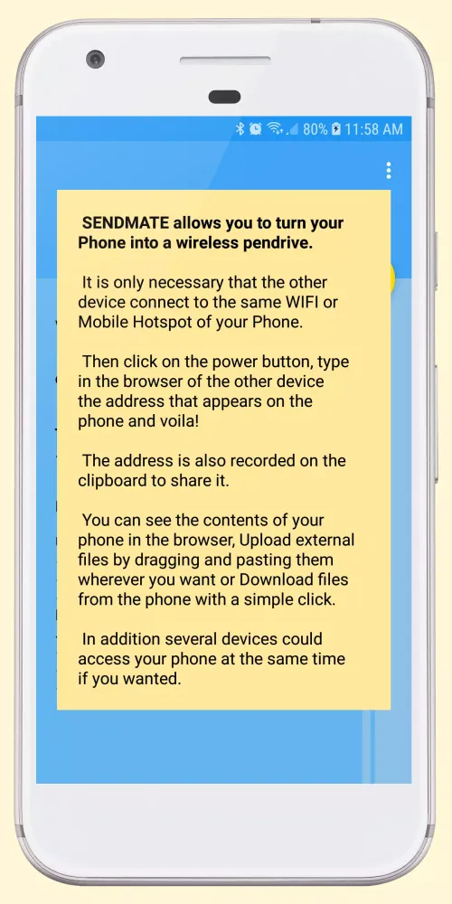 Utilize the Wi-Fi network or your phone's mobile hotspot to connect and share files instantly. By simply turning on Sendmate and providing your device's unique address to the web browser, you gain immediate access to all files stored on your phone, without the hassle of Bluetooth pairing.