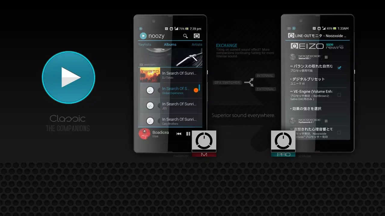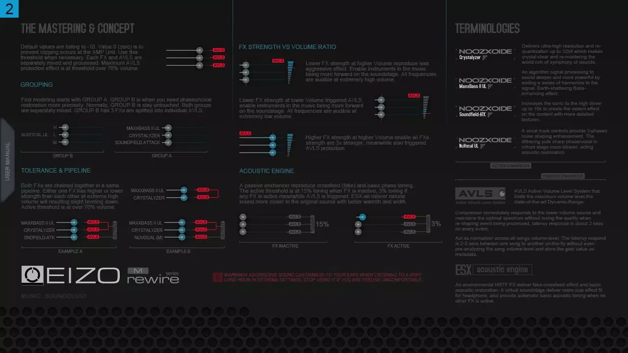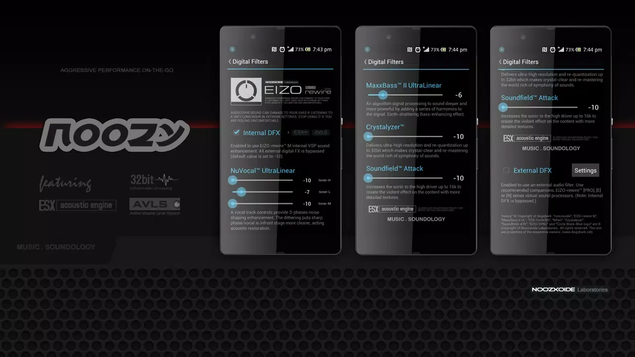 At the heart of the Noozy experience lies its exclusive software-layered 32-bit floating-point processing power, embodied in the VSP “EIZO-rewire M Series”. This proprietary technology delivers a superior, aggressive sound profile, allowing users to finely control their content effects through the innovative ESX acoustic engine. This feature specifically enhances the headphone experience with a crossfeed effect, automatic toning adjustments, and acoustic restoration, complemented by the MaxxBass II UltraLinear, which enriches the bass spectrum up to 1.8 octaves, creating a powerful auditory impact.