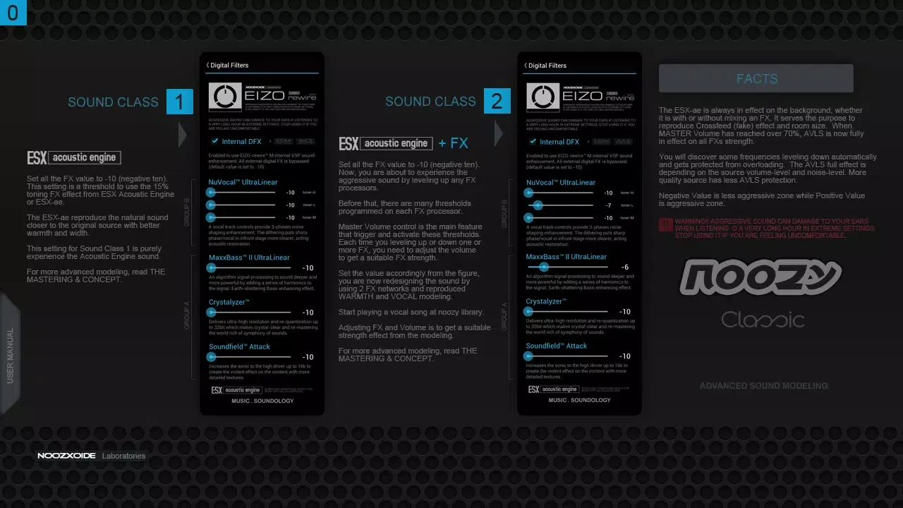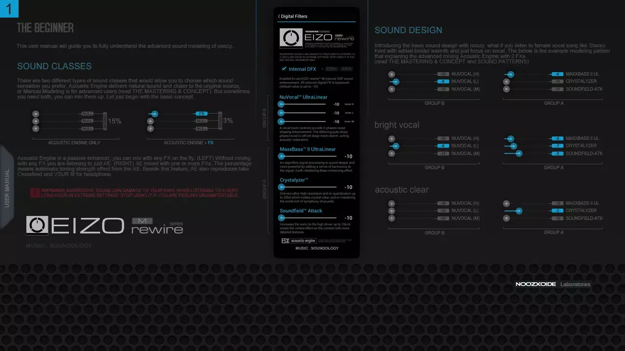 The Crystalyzer and Soundfield Attack features add depth and clarity to your music, elevating the resolution to unprecedented levels, ensuring that every note and detail is crystal-clear. The NuVocal UltraLinear function refines the vocal and phase sound, enhancing the overall acoustics and restoring the natural balance of sound. Coupled with the state-of-the-art AVLS system, which normalizes volume levels across songs without prior analysis, and acts as a smart overload protection system, the Noozy guarantees consistent and exceptional sound performance.