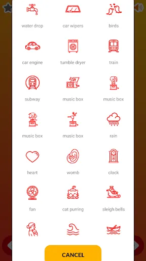 ● hair dryer ● washing machine ● vacuum cleaner ● car motor ● nature sounds ● train ● subway ● washer-dryer ● windshield wipers ● mountain stream ● dripping water ● music box (lullaby) ● shower ● white noise ● musicbox ● heartbeat ● purring of a cat and many more.
