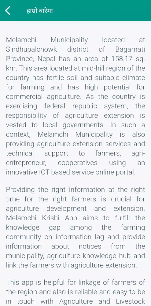 Melamchi Krishi is a groundbreaking mobile application developed by Melamchi Municipality, located in the Bagmati Province of Sindhupalchowk, Nepal. This innovative platform was created to revolutionize agricultural practices within the region by leveraging modern Information and Communication Technology (ICT). The app serves as a digital bridge between the local government and the farming community, ensuring that vital agricultural information reaches farmers in real-time.