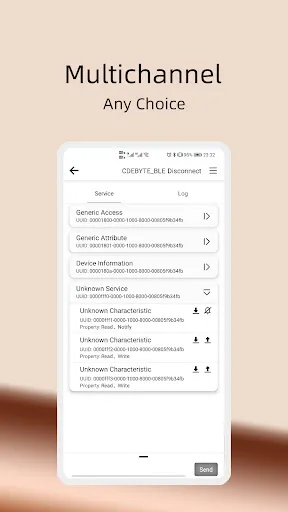 Communication: The tree structure lists all services and feature UUIDs and feature attributes, supports feature reading and writing, Notification on and off, Indication on and off, supports multiple encoding methods, such as UTF-8, GBK, or directly use sixteen Hexadecimal, support periodic sending of messages
