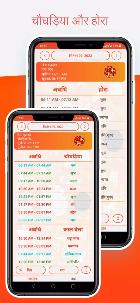 Choghadiya and Mahurats: Includes day and night Choghadiya, Rahu Kal (राहु काल), Yama Gand (यामगण्ड), Gulik Kaal (गुलिक काल), Abhijit Mahurat (अभिजीत महूरत), and Dainika Hora (होरा), all accurately calculated based on your location.