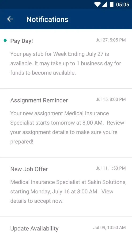 Another key feature is the ability to manage your pay stubs conveniently within the app. This allows you to review your earnings history at any time, providing transparency and peace of mind. Additionally, you can set your availability for new assignments, allowing you to communicate your schedule preferences effortlessly.