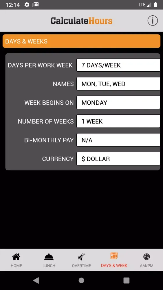 Customizable Work Schedule: Customize your work schedule by setting the number of workdays per week, naming the days, and defining the start day of your pay period. Choose between a weekly or bi-weekly pay period to fit your needs.