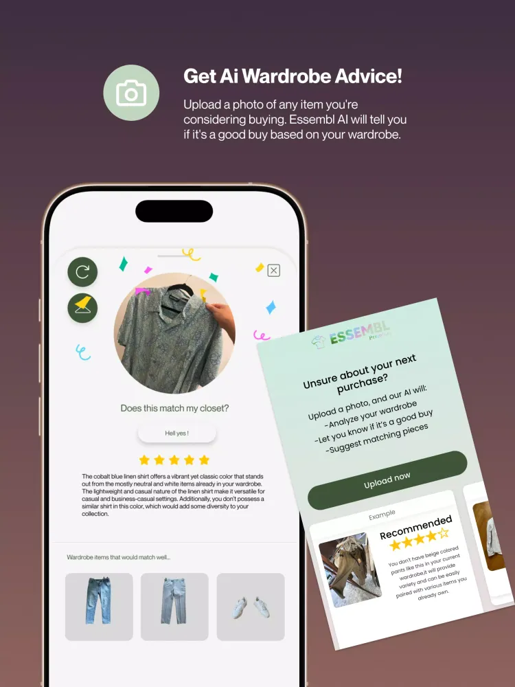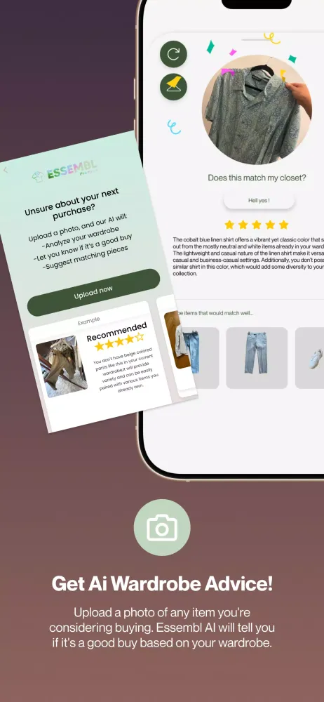 Before making a new purchase, snap a photo and let Essembl evaluate whether the item will complement your existing wardrobe. Essembl provides insightful reasons and style tips to help you decide if the piece is right for you. If it's a match, Essembl even offers guidance on how to seamlessly integrate the new addition into your existing outfits, ensuring that every purchase enhances your wardrobe.