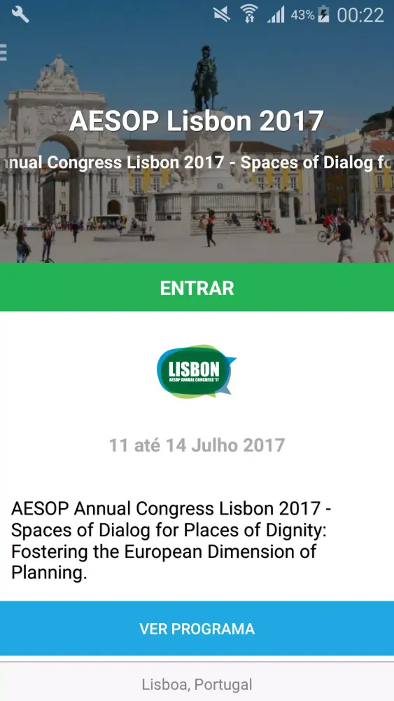 Welcome to the official app for the AESOP Annual Congress in Lisbon, 2017. The theme of this prestigious event is "Spaces of Dialog for Places of Dignity: Fostering the European Dimension of Planning," scheduled from July 11-14, 2017, in Lisbon, Portugal.