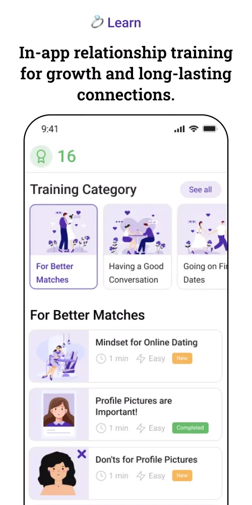 We believe that building a successful relationship goes beyond just finding the right person. That’s why we’ve developed an in-built relationship training program to help you become the best partner you can be. Our expert-designed modules cover essential skills such as communication, trust-building, and conflict resolution. By participating in these programs, you can earn badges that boost your profile visibility, making it easier to connect with compatible matches.