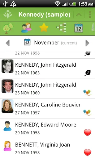 - Browse events calendar (birth, marriage, ...) for each month*. Today's events are highlighted.