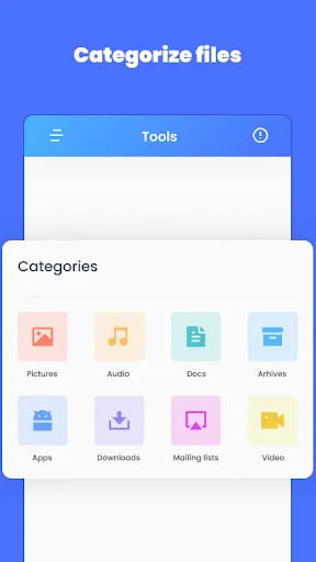Smart Categories: easy surfing through your files with file categories. Images, Pictures, Videos, Movies, Audio , Music, Documents (xls, pdf, etc), Archives (zip, rar).
