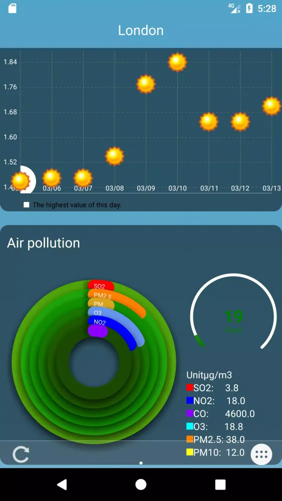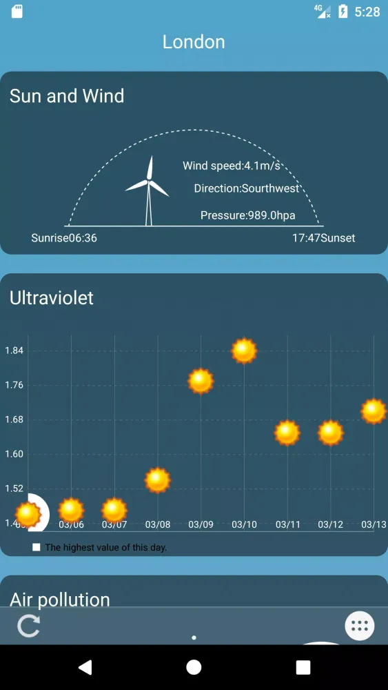 Stay informed about local air quality with POPWeather's air pollution index. The app displays detailed values for six major pollutants, allowing you to make informed decisions about your environment.