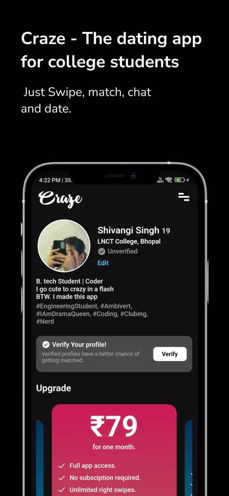Craze is not just another dating app; it's a vibrant community where college students can connect with like-minded individuals who share their passions, dreams, and aspirations. With Craze, you can swipe through profiles and find matches that resonate with your college dating journey. Our platform fosters a sense of belonging and helps you discover new connections based on common interests and values.