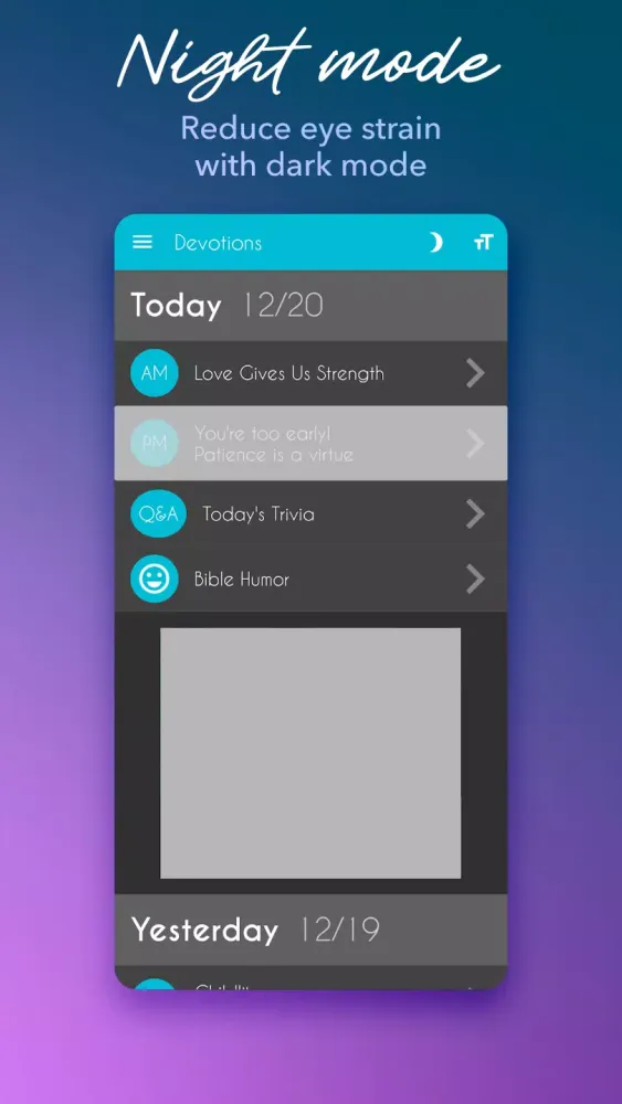 The app caters not only to Christians but also to those looking to explore their faith outside traditional church settings. You can share your favorite devotionals with loved ones, fostering a sense of community and mutual encouragement. The Daily Bible Devotion app also supports multiple Bible translations, including the New Living Translation (NLT), King James Version (KJV), and New International Version (NIV). Simply tap the moon icon to toggle between light and dark modes, ensuring a comfortable reading experience regardless of the lighting conditions.
