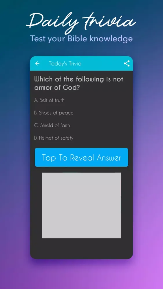 - Bible Trivia: Test your knowledge and enhance your understanding of the scriptures with daily trivia questions.