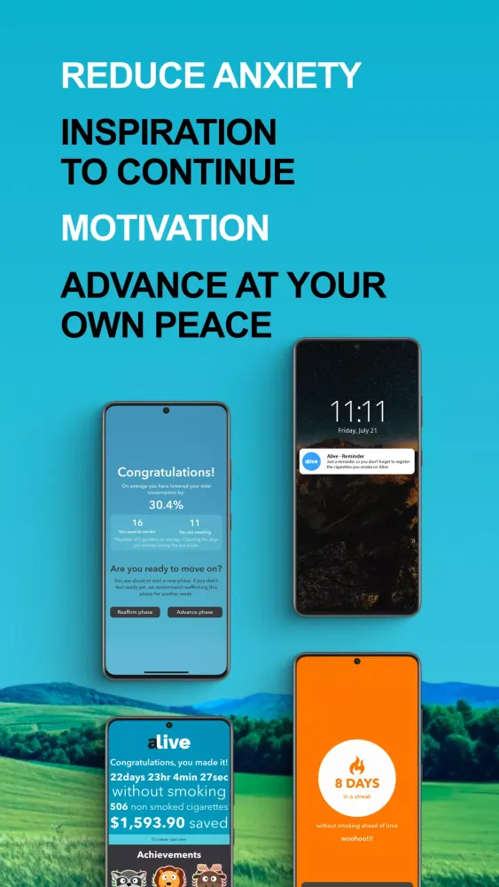 Are you ready to take control of your life and break free from the chains of nicotine addiction? The "Quit Smoking Gradually - Alive" app is here to guide you through the journey of quitting smoking or vaping in a gentle, effective manner. Designed to help you cut down on cigarettes gradually, this app ensures that the process is manageable and anxiety-free. Whether you smoke daily or occasionally, this app is tailored to fit your unique habits and needs.