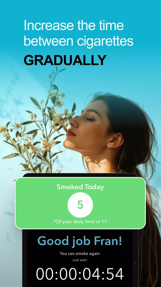 The app works by calculating optimal waiting times between cigarettes, incrementally extending these intervals each week. This gradual increase helps your body adapt to longer periods without nicotine, significantly reducing cravings and anxiety. As you move through the program, the app transitions into advanced methodologies designed to support you until the very end of your journey. During the final four phases, you'll have the autonomy to choose when to smoke the allotted cigarettes, further empowering you to take charge of your habits.
