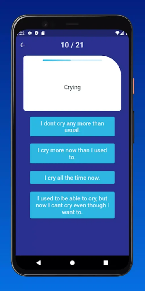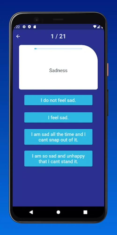 Our app provides a detailed 28-question Beck Depression Inventory test that assesses your emotional state accurately. With an intuitive user-friendly interface, you can complete the assessment effortlessly. The questions are carefully crafted to provide a thorough understanding of your current mental health status.