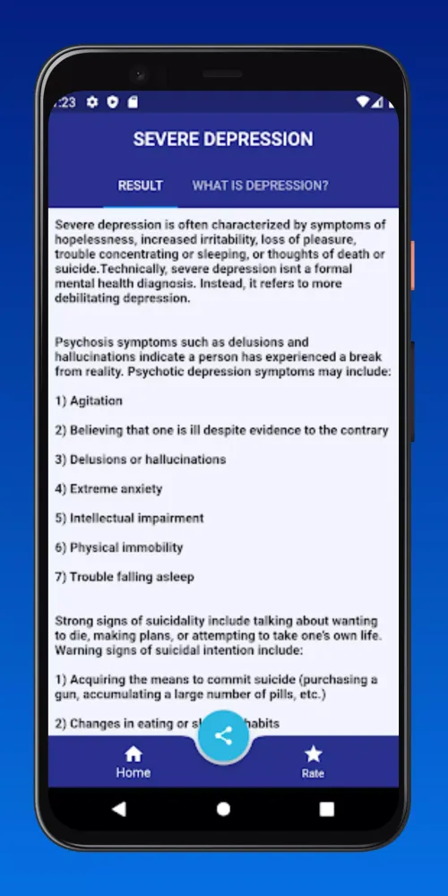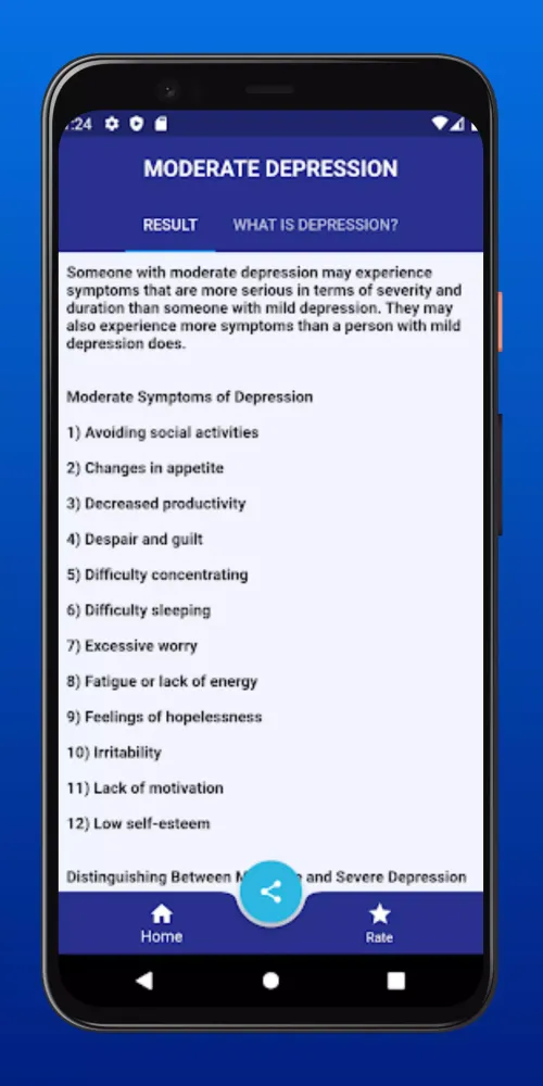 Upon completing the test, you will receive instant feedback categorized into levels of depression: