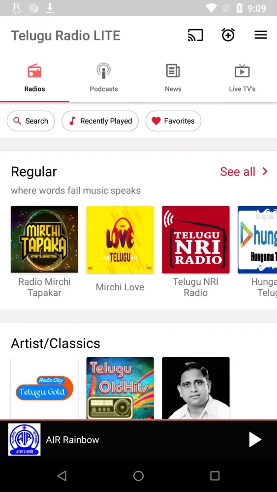 - Save your favorite Telugu radio stations in the Favorites tab for quick access.