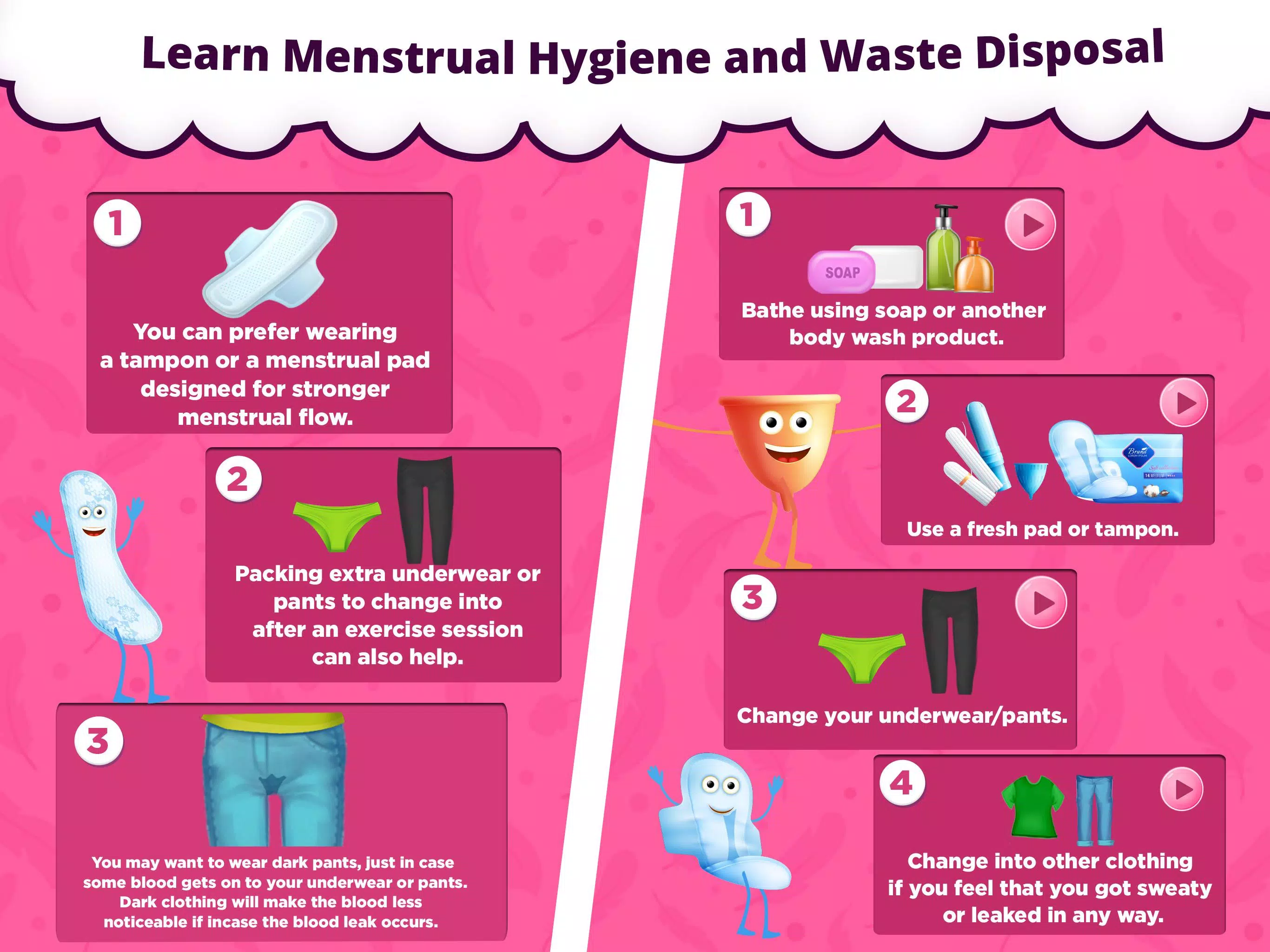 The game covers a wide range of essential topics that every girl should know before experiencing her first period. From understanding what periods are and how they work, to learning how to manage them at school and in daily life, "Periods - Game for Girls" provides comprehensive knowledge in an easy-to-digest format. It also includes information on using sanitary pads, dealing with period-related symptoms, and maintaining proper hygiene throughout the cycle. By breaking down complex concepts into simple, interactive lessons, the app ensures that girls can grasp these vital facts without feeling overwhelmed or embarrassed.