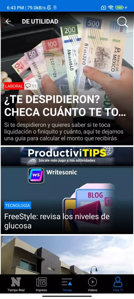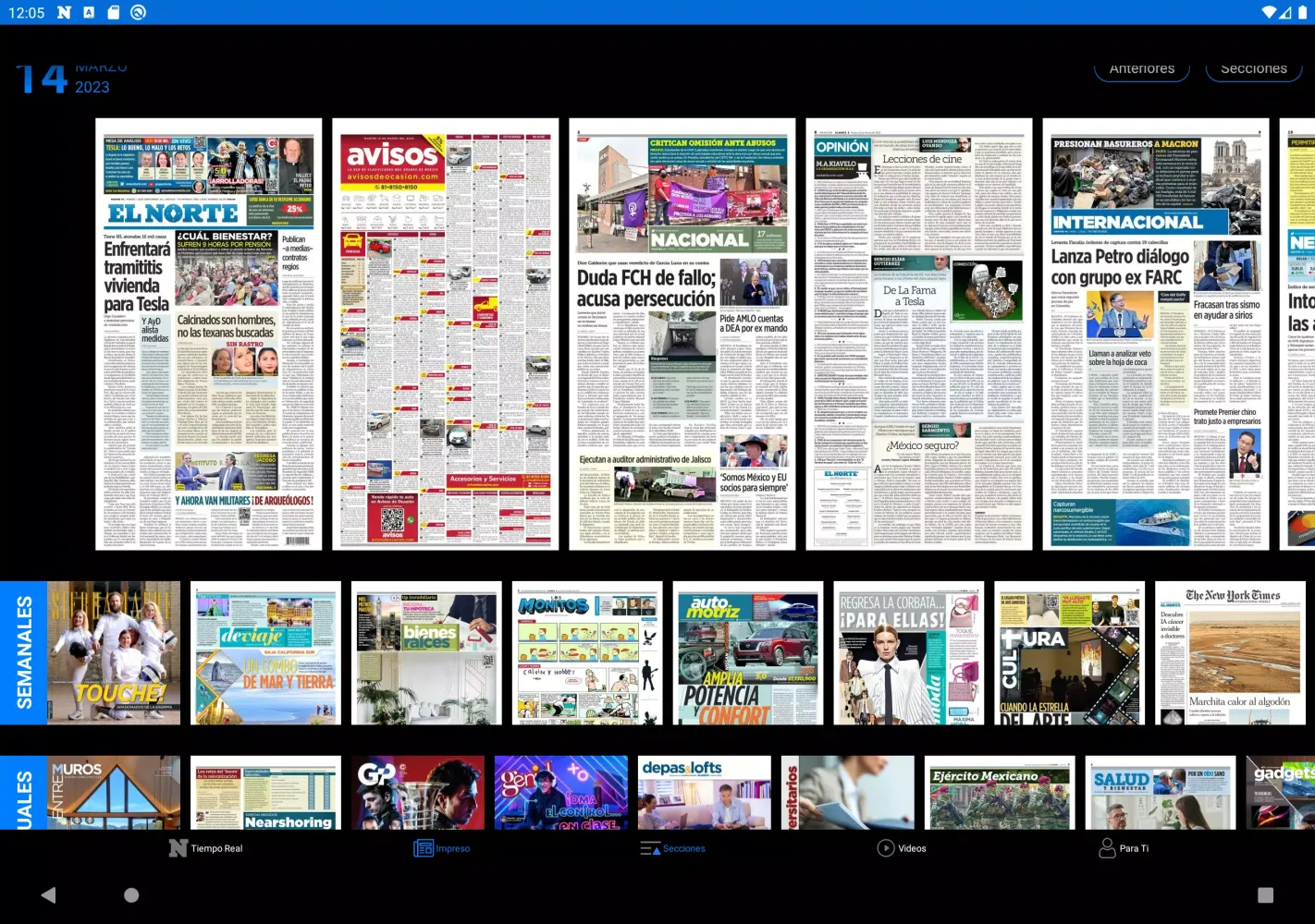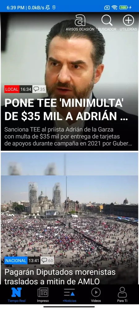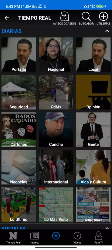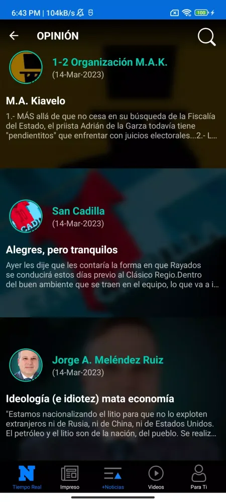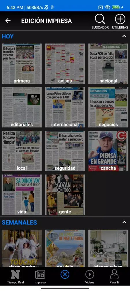 The Favoritos (Favorites) section allows you to save articles or slide shows that pique your interest, ensuring you can revisit them whenever you wish. For those moments when you're driving or exercising, the Escuchar Notas (Listen to Articles) module lets you stay up-to-date by simply selecting the content that matters to you. All our historical content is always within your reach—use the search tab to find past articles, photos, videos, and the opinions of your favorite op-ed columnists.