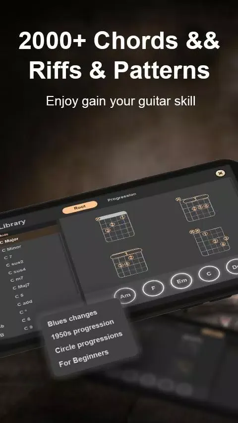 When you have some free time, playing rhythm simulation games is a great way to spend it. The app offers countless tabs with easy lessons, and new songs are added daily. You can jam along to your favorite tunes and create impressive backing tracks. Master over 2000 chords and delve into chord progressions to craft new tabs. Just like playing a real guitar, you can easily enjoy strum patterns, fingerstyle, arpeggios, riffs, and strikes. Adjust the BPM of patterns or loopers to suit your practice needs, ranging from a romantic 70 BPM to a rockin' 250 BPM. Soon, you'll be able to create your own loops using the chord progression panel and customized looper.