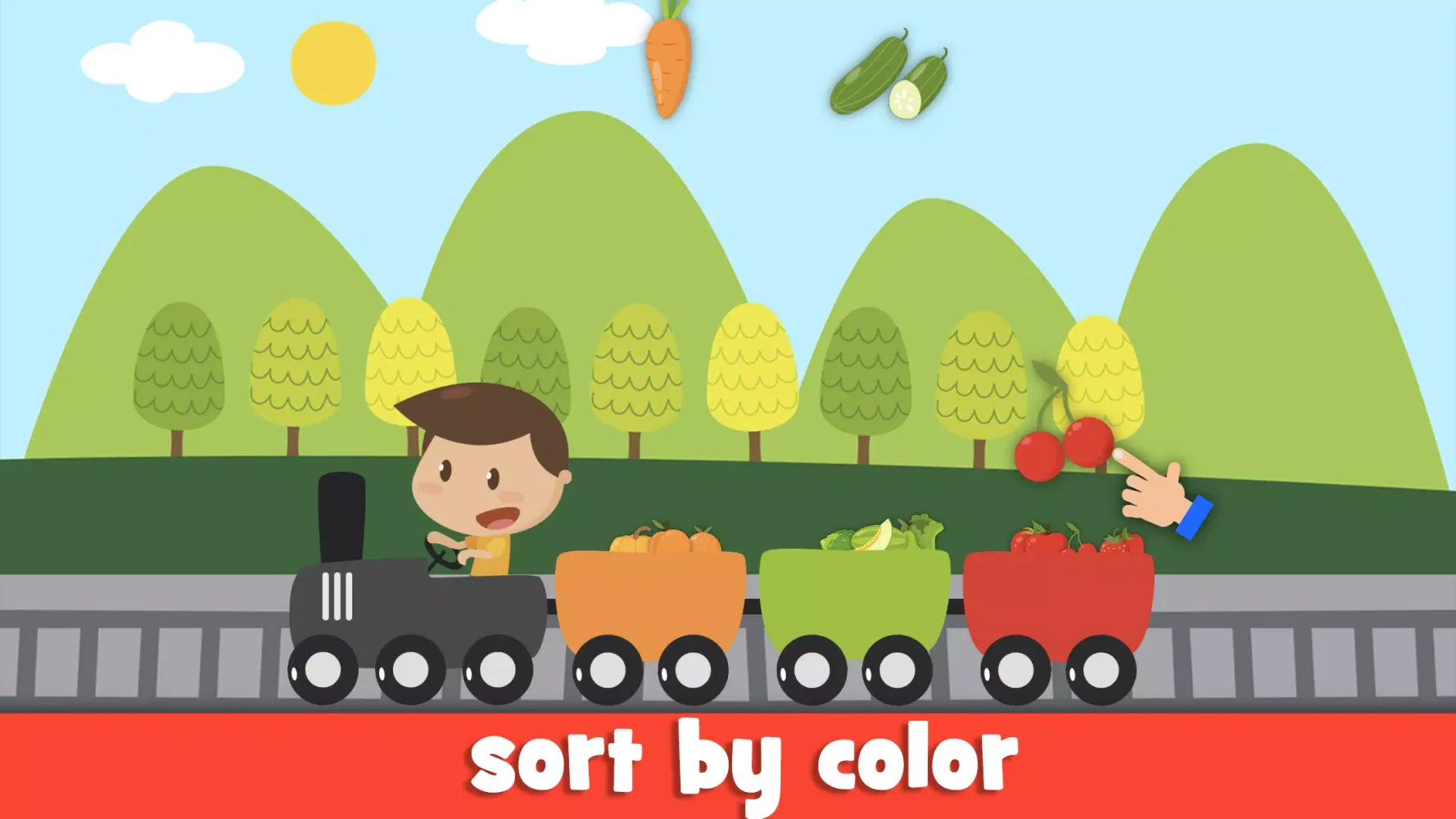 In addition to vocabulary building, the app includes matching games that enhance cognitive skills by encouraging toddlers to match drawings with their corresponding pictures. The color games involve a colorful train where kids learn to recognize and categorize colors, while the number games involve sorting fruits and vegetables by quantity, reinforcing the concept of numbers and quantities.