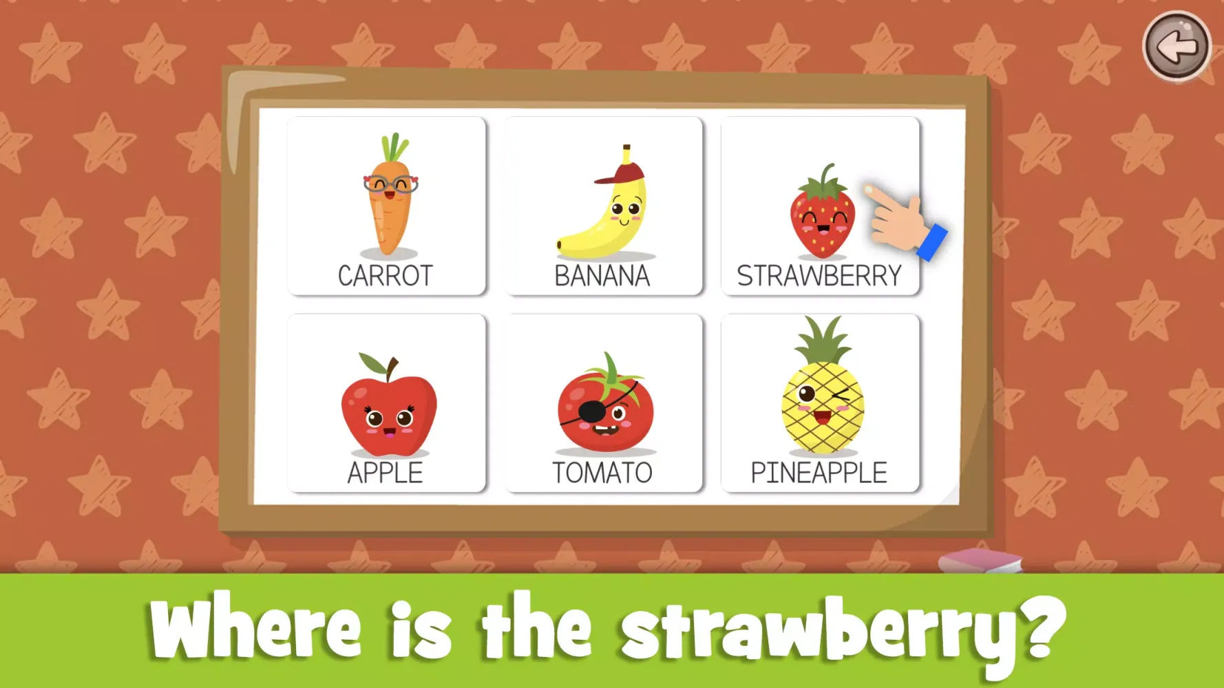 The app features 12 educational games that cater to various aspects of early childhood development. These games introduce toddlers to shapes, colors, sizes, and numbers through interactive and playful activities. For instance, children can explore the names of 30 common fruits and vegetables through two engaging activities: an interactive book that plays the name of each fruit when clicked, and a selection game where kids choose the correct image based on the spoken word.