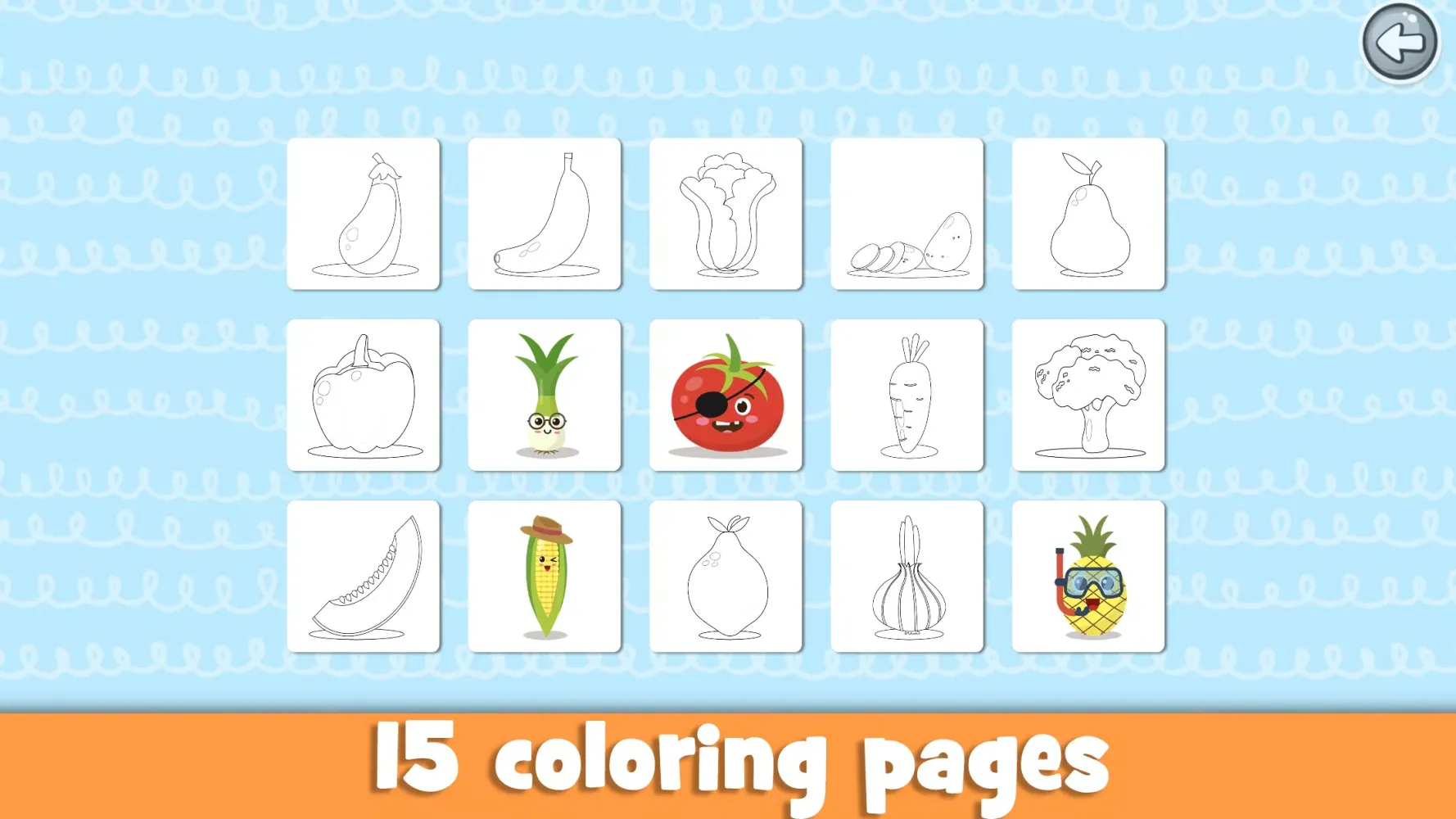 The app also focuses on teaching sizes (small, medium, and large) and shapes (such as circles, squares, and triangles) through interactive activities. Children can practice their fine motor skills and creativity with coloring games, featuring 15 different fruits. Furthermore, toddlers can solve funny vegetable puzzles that depict amusing scenarios, making learning both fun and engaging.