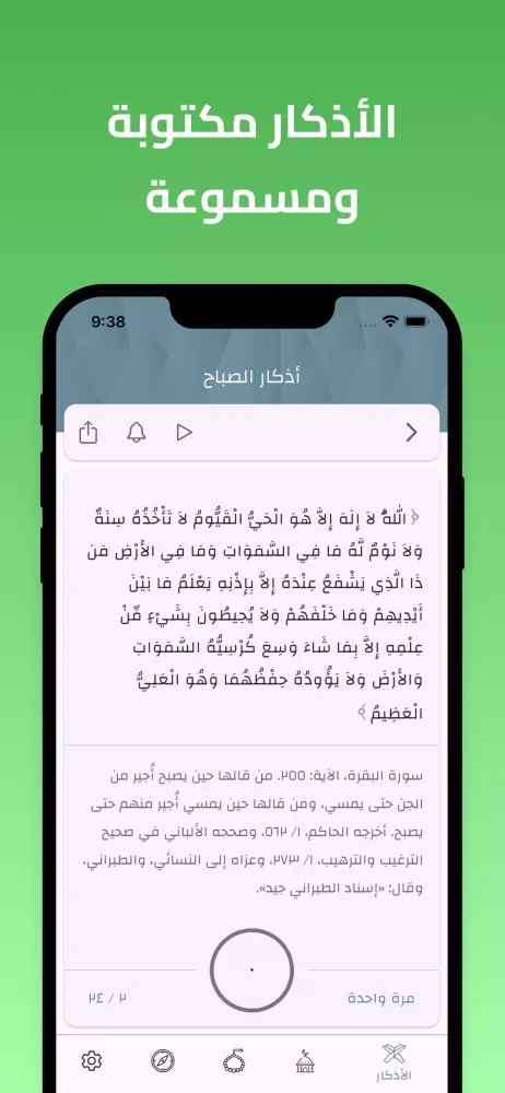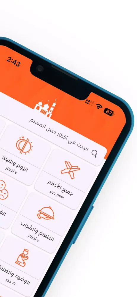 The application includes a wide range of Islamic remembrances and supplications from the book "Fortress of the Muslim from the Remembrances of the Qur’an and Sunnah." These include morning and evening supplications, supplications for sleeping, waking up, and performing istikharah. All supplications are correctly diacritized and come with the chain of transmission for each hadith or Qur'anic verse, along with the virtues of each remembrance.