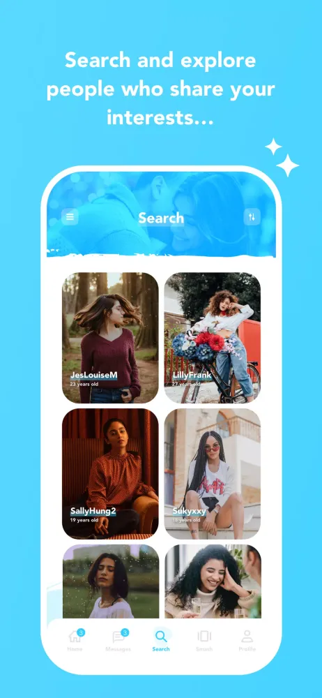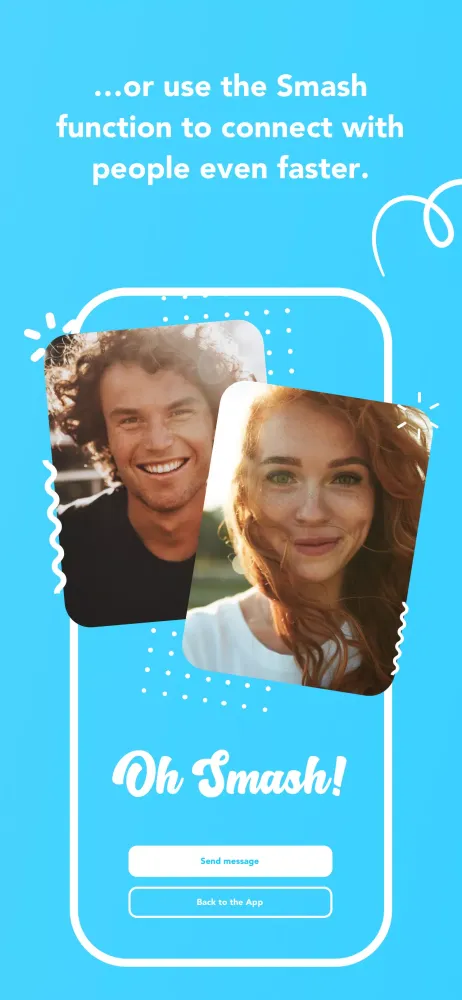 - Smash (unique matching system): Let our algorithm suggest potential matches.
