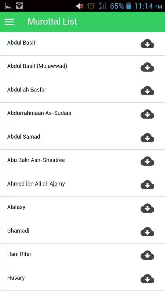 The application includes Murottal recitations of the Quran from renowned reciters, including: