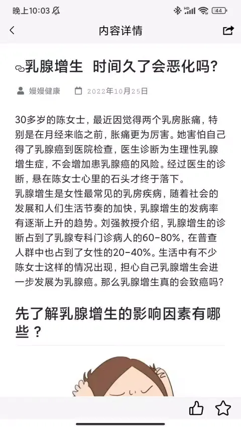 The "嫚嫚" app is a cutting-edge digital health management platform designed specifically for women suffering from chronic conditions such as breast hyperplasia and breast nodules. Leveraging advanced big data analytics and artificial intelligence algorithms, the app offers comprehensive, multi-disciplinary support to help users manage their health more effectively. Whether you're looking to monitor your condition, access personalized insights, or simply learn more about maintaining good breast health, the "嫚嫚" app provides a one-stop solution.