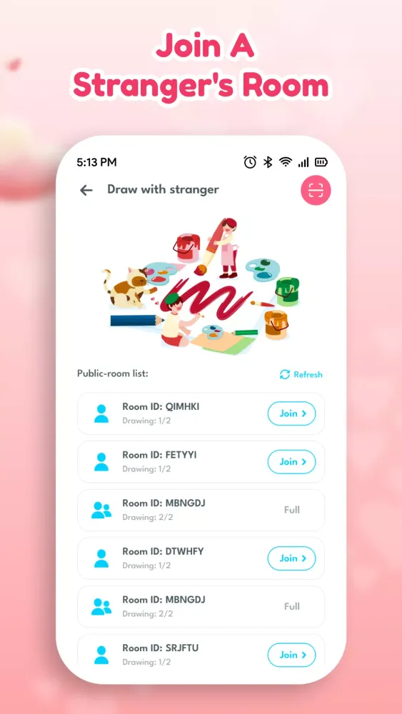 - Random Rooms: Join a random room to connect and draw with strangers.