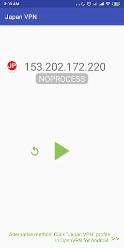3. Click on "Play" button , the IP address of OpenVPN profile will be save, import and start to connect to the server by pass command to "OpenVPN For Android" app.