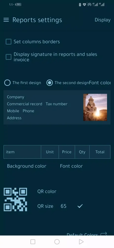 The settings section allows users to save institutional data, including the commercial register, tax number, and VAT details. Users can choose whether to add tax to the unit price or isolate it and upload the institution's logo to be displayed on reports and sales invoices. Additionally, the application supports toggling the signature on reports and changing the invoice header.