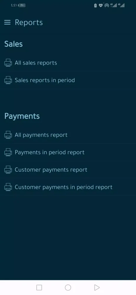 The reports section provides comprehensive financial insights. Users can generate reports such as all sales reports, sales reports within a specific period, financial supply reports, period supply reports, customer supply reports, and customer supply reports within a specified period.