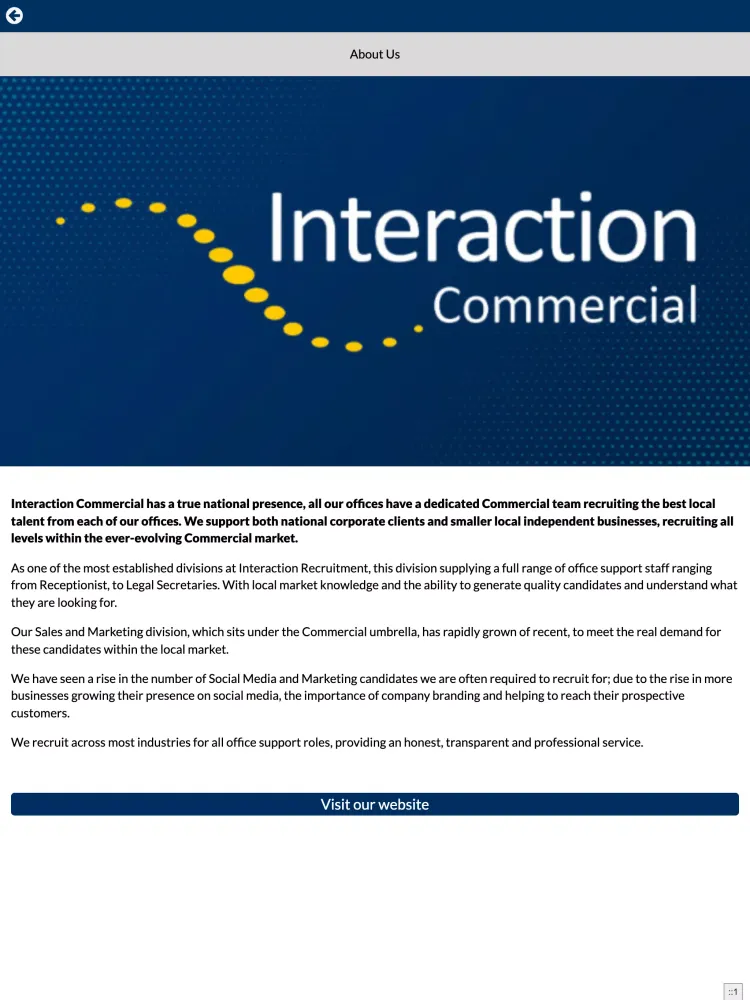 Interaction Recruitment PLC, a leading force in the recruitment industry since 1986, is proud to introduce its innovative mobile app, "Interaction Recruitment." Designed to streamline the recruitment process and enhance user experience, this app caters to both job seekers and employers alike. With over three decades of dedication to excellence, Interaction Recruitment has established itself as one of the largest privately owned independent recruitment companies in the nation. At the heart of their mission is a commitment to quality, innovation, and personal connection, ensuring that every interaction is meaningful and impactful.
