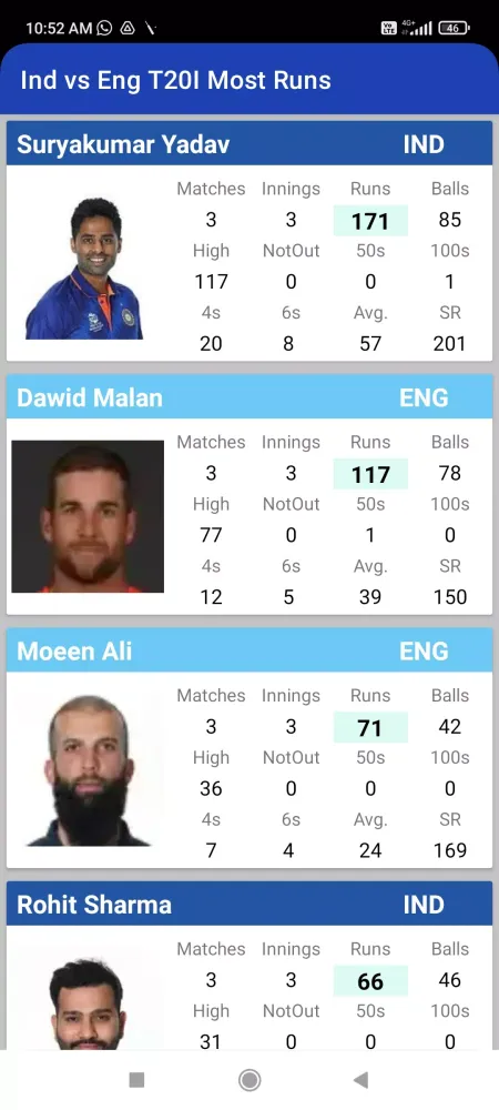 Get to know the iconic players in the series, such as Virat Kohli, Rohit Sharma, Yashasvi Jaiswal, MS Dhoni, Ravindra Jadeja, and many more. The app offers extensive player statistics, including runs scored, wickets taken, most sixes and fours, and individual player analysis. You'll also find squad lists for various teams and a full player roster for each match. Additionally, you can track the top-performing players for your dream team and mycircle11 selections.