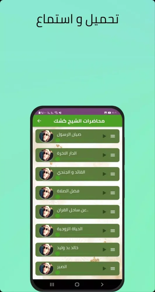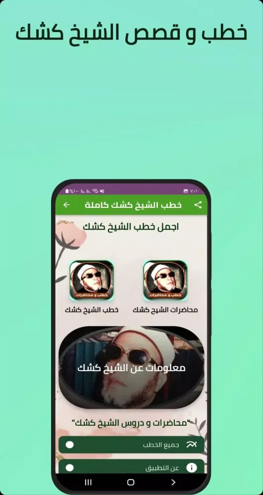 Experience the most touching and influential lectures by Sheikh Kishk in high-quality MP3 audio format, with clear and crisp sound. The program is filled with beautiful, awe-inspiring, and prominent sermons by Sheikh Abdul Hamid Kishk, both in audio and written form. You can benefit from this information effortlessly, without having to search through websites and blogs. The app includes all of Sheikh Kishk's complete sermons without requiring an internet connection, along with his biographical details and photos.