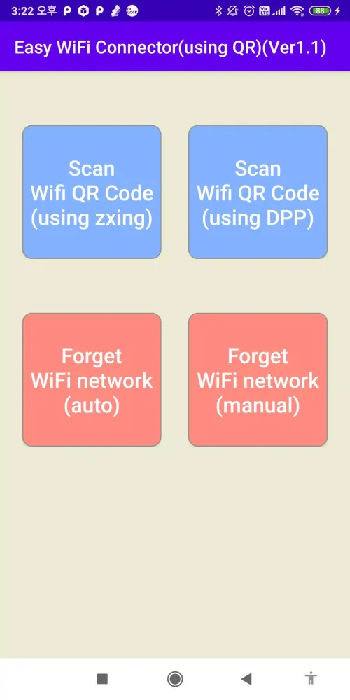 zxinglibrary, but remember to click the Allow button when prompted. - WiFi Setting Shortcut: Access the WiFi settings window directly to delete Wi-Fi information. Note that due to restrictions, the app cannot programmatically delete Wi-Fi networks. However, this functionality will be added if Android supports it in the future.