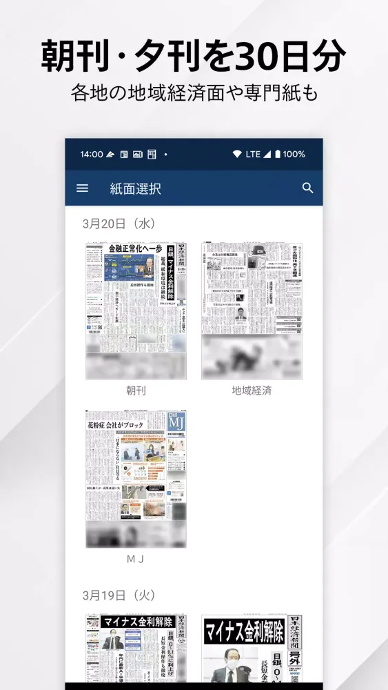 The app offers extensive functionality for reading and managing content from the Nihon Keizai Shimbun. You can browse both the morning and evening editions of the newspaper, along with regional economic sections from across Japan and various specialized publications, all within the last 30 days. These articles are displayed exactly as they appear in the printed edition, providing a seamless reading experience.