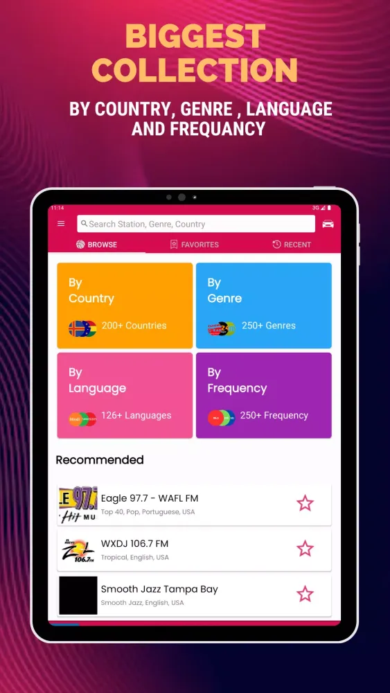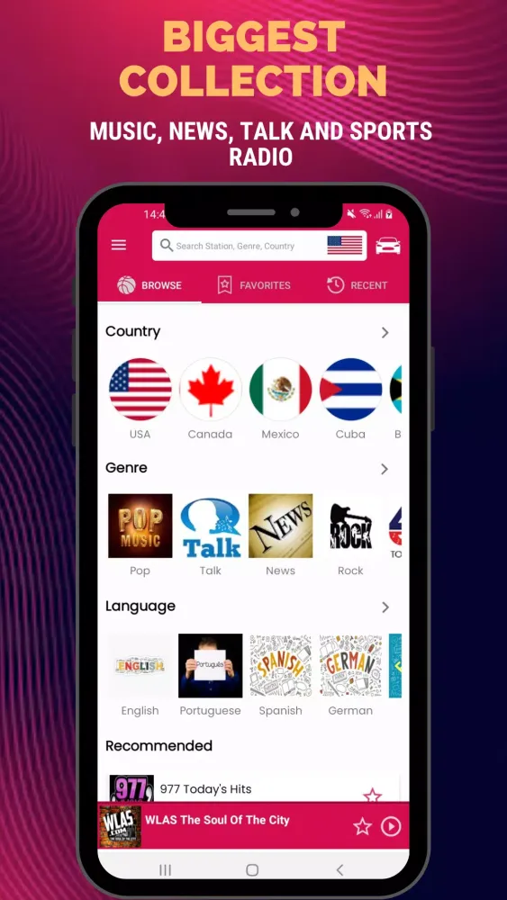 The app also displays flags of all independent countries, making it easy to select your desired country and enjoy your favorite radio station with just one touch. The NextRadio feature enables you to switch between the previous and next radio stations effortlessly. The volume control is conveniently located on the screen, allowing you to adjust the audio level without leaving the main interface. The recent list feature keeps track of your most recently listened-to stations, making it simple to revisit your favorite content. The search function allows you to find and tune into your desired station instantly.