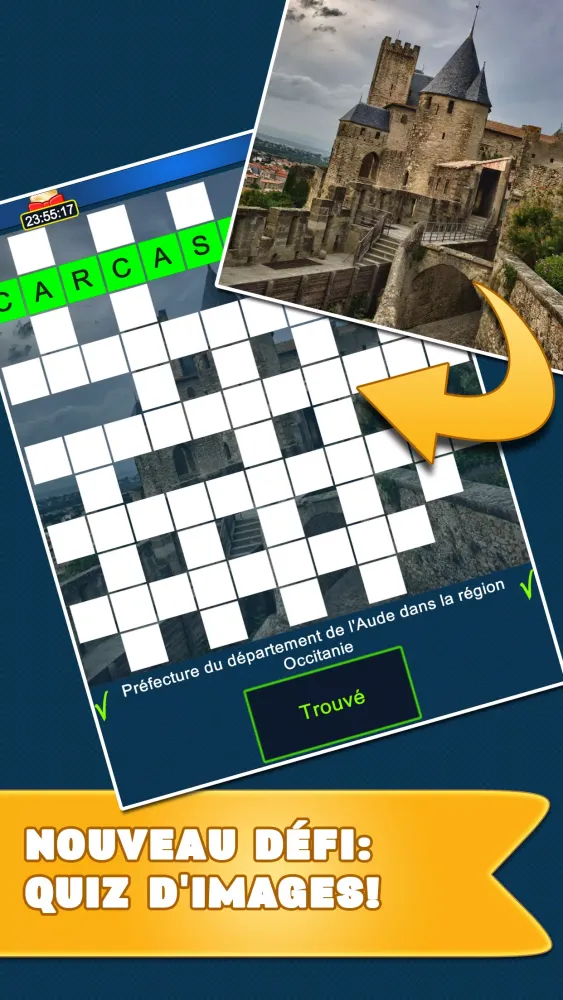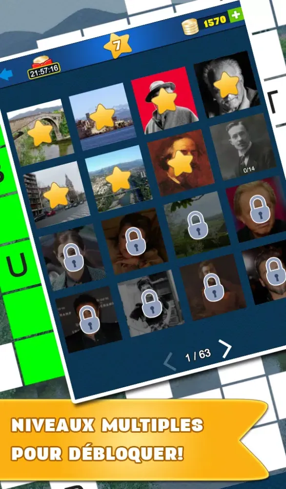 The classic game "Crossword" combined with a picture quiz experience awaits you in this engaging application! Dive into the world of French crosswords, where each level presents you with an intriguing image-based challenge. Your objective is to find the correct answers to these image-based quizzes and use them to solve the crossword puzzles.