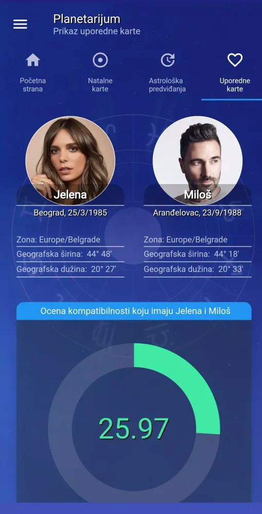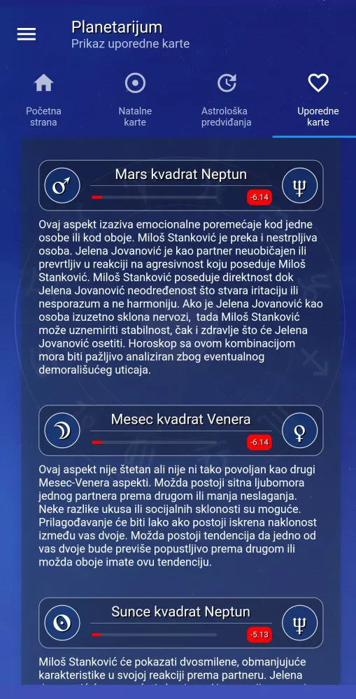 Comparative Horoscope: Create a comparative horoscope that interprets the relationship dynamics between two individuals. This feature includes a percentage representation showing the level of compatibility, helping you make informed decisions about relationships, marriages, friendships, or business partnerships.
