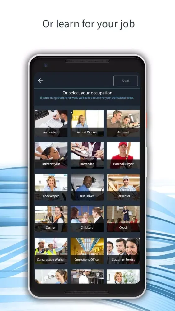 Create a personalized course tailored to your interests and needs. You can design a course that revolves around the things you love, or even create one specific to your occupation from a list of 60 professions. Bluebird's personalized language courses can last from a month to a year, adapting to your age, skill level, and available time.