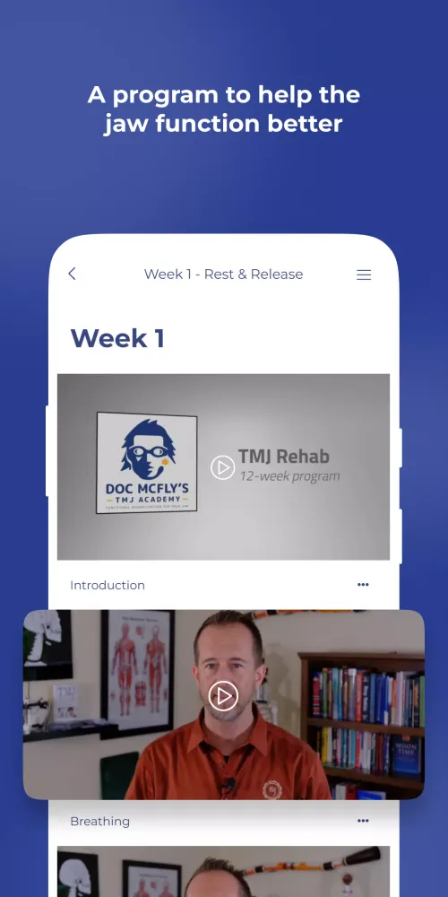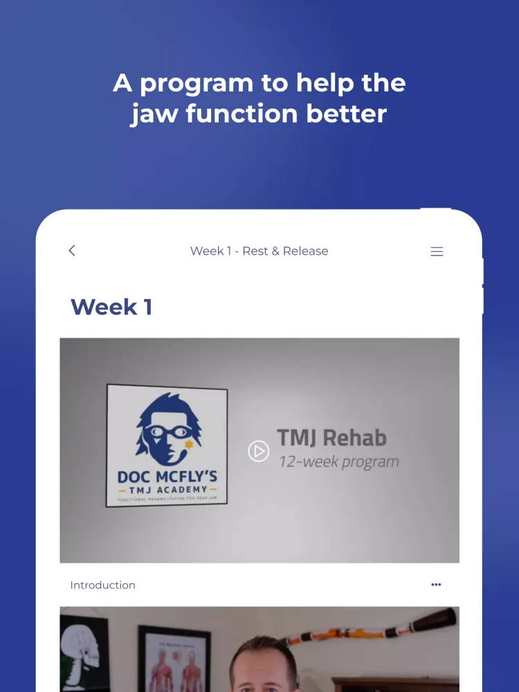 This application, TMJ Rehab, is designed to provide a comprehensive and guided 12-week rehabilitation program specifically tailored for individuals suffering from Temporomandibular Joint (TMJ) Dysfunction. The primary goal of this app is to help users improve the function of their jaw, thereby alleviating pain, reducing clicking sounds, and preventing jaw locking issues. Additionally, it can be beneficial for those experiencing sleep apnea.