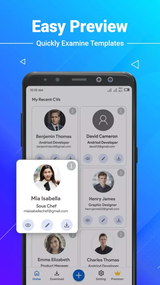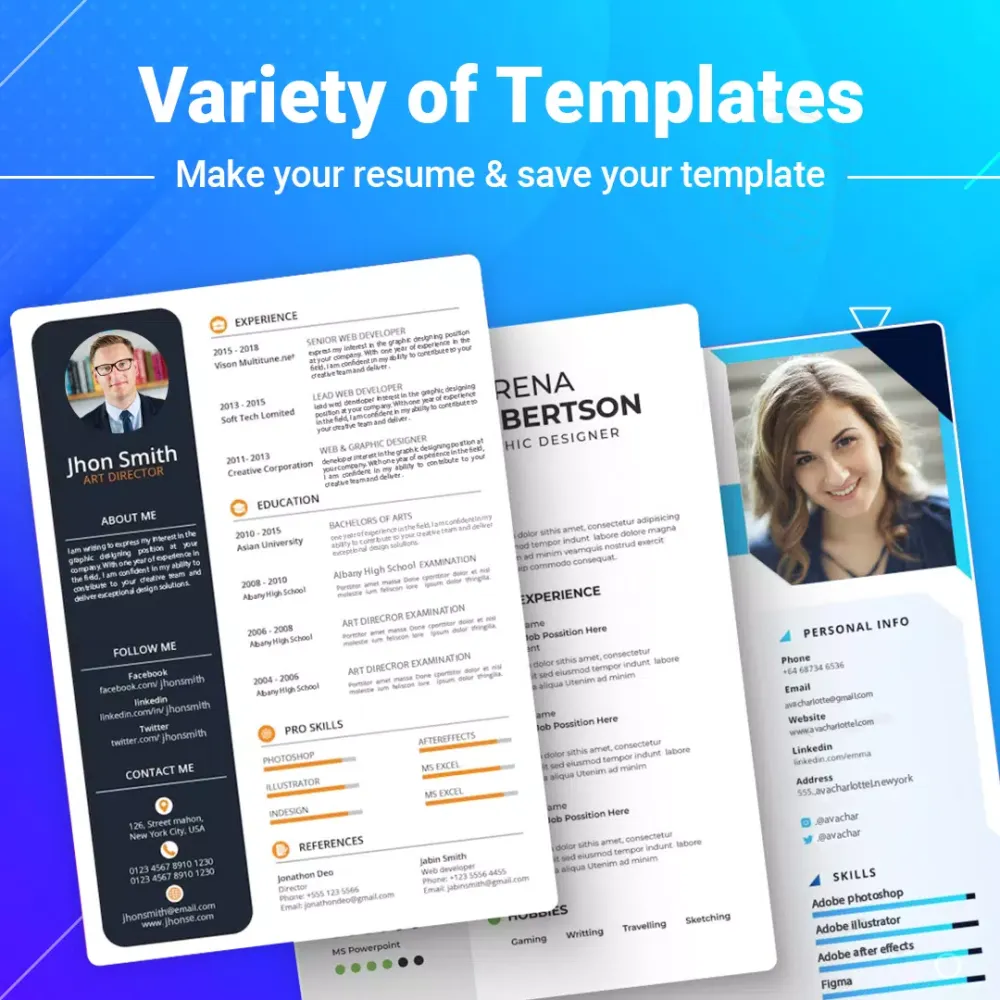 Our Resume Builder: CV Maker app empowers you to download your resume in PDF format, allowing you to email or print it directly for easy sharing during your job application process.