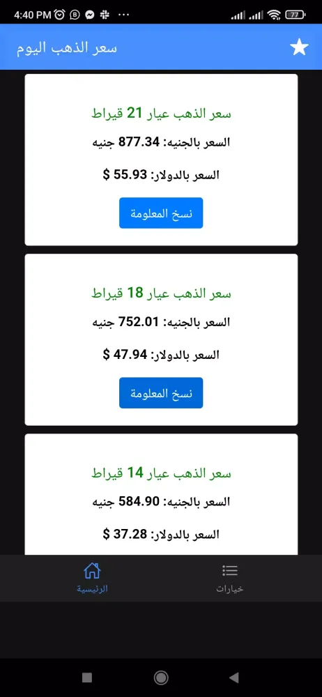 - Multiple Currency Support: It displays gold prices in both Egyptian pounds and US dollars, catering to users across different regions.