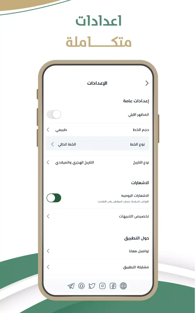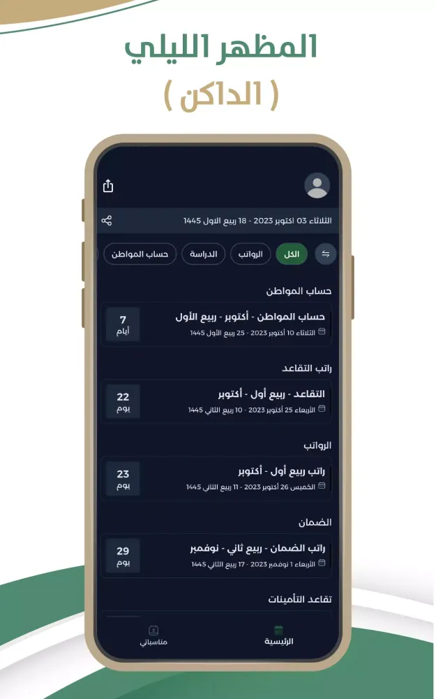 In addition to event reminders, the Saudi Calendar app provides you with today's date in both calendar systems, ensuring you never miss a day. You have full control over all settings, allowing you to customize the app according to your preferences. For those who prefer a darker interface, the app also includes a Dark Mode option, enhancing usability and comfort during night-time use.